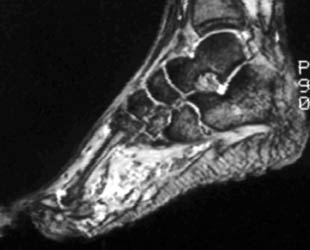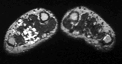 39 year old male with an extensive soft tissue mass involving the plantar aspect of the foot, dissecting between the third and fourth metatarsals, and extending into dorsum of the foot. The mass has intermediate signal on T1 and very high signal on T2 weighted images, and appears serpiginous. |