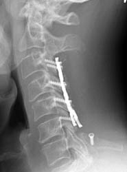 hospital. Note migration of left C6 screw. It has loosened and fallen out. This